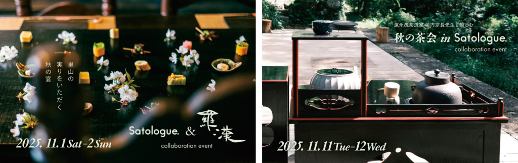沿線まるごと株式会社は、プロジェクトの中核施設「Satologue」にて、奥多摩の秋のベストシーズンに「里山 秋の宴」と称し、伊豆の有名店「羅漢」とコラボした特別なランチ&ディナーのご提供と、遠州流茶道家・堀内宗長氏が点てる本格的な茶会を体験できる2つのイベントを開催します。