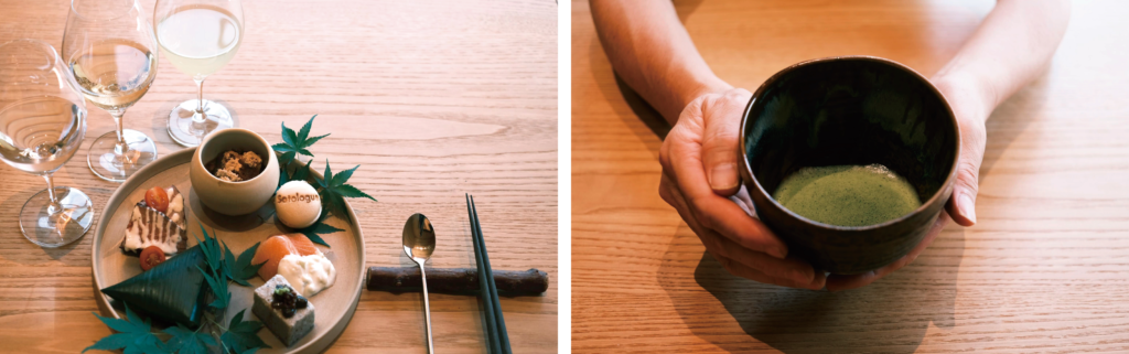 秋の自然に囲まれた「Satologue」の敷地内で、茶道家・堀内宗長氏による本格的な茶会を開催します。軽いお酒とお食事のあとに、メインのお茶を楽しんで頂く形式の茶会で、前半に「Satologue」による本イベントのために考案した“秋の肴6種”と、肴に合わせたお飲み物(日本酒・日本ワイン・オリジナルノンアルコールカクテル)のペアリングを召し上がって頂くことでお腹を満たし、軽い飲酒が気持ちを和ませてくれます。