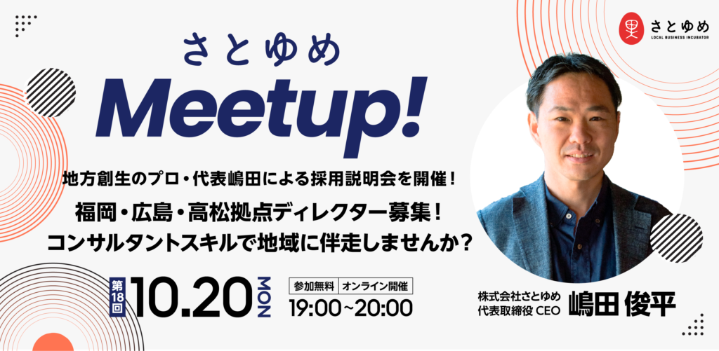 【参加者募集】2025年10月20日(月)19:00〜20:00、弊社代表・嶋田が採用説明会「さとゆめMeetup!」を開催します!