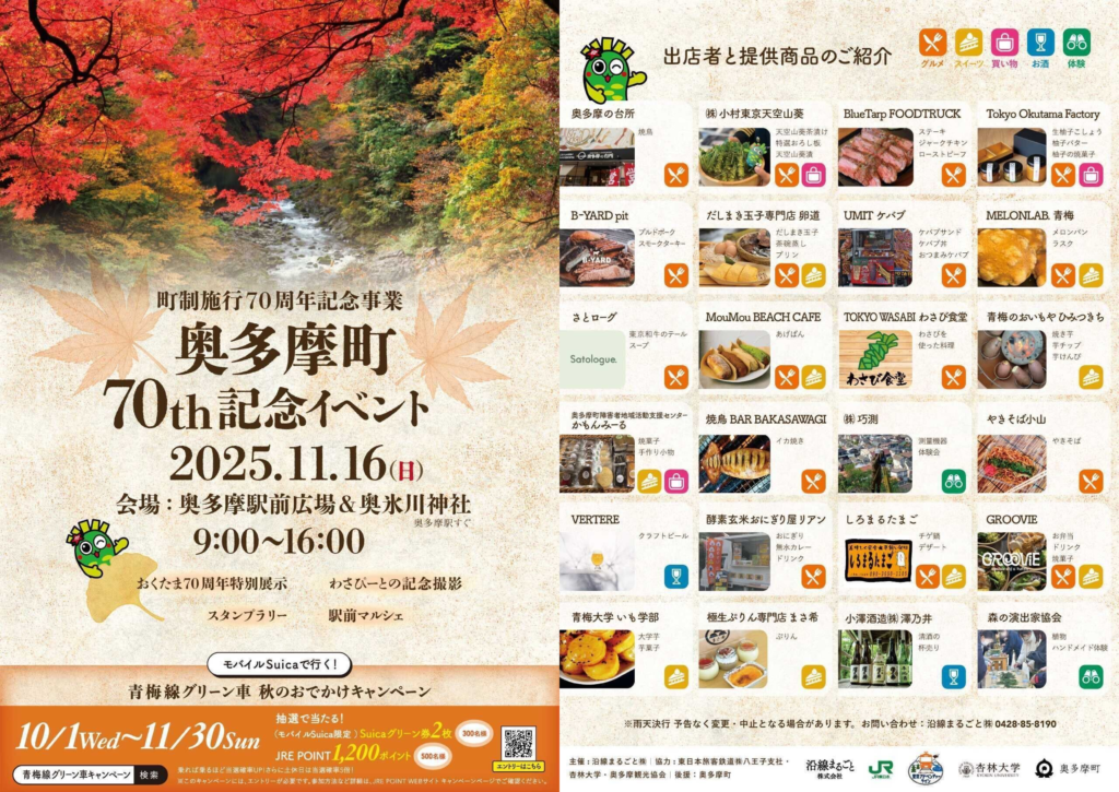 地元のグルメやスイーツ、工芸体験、地酒、そして奥多摩70周年を記念した特別展示など、盛りだくさんの内容で、皆様をお待ちしています!