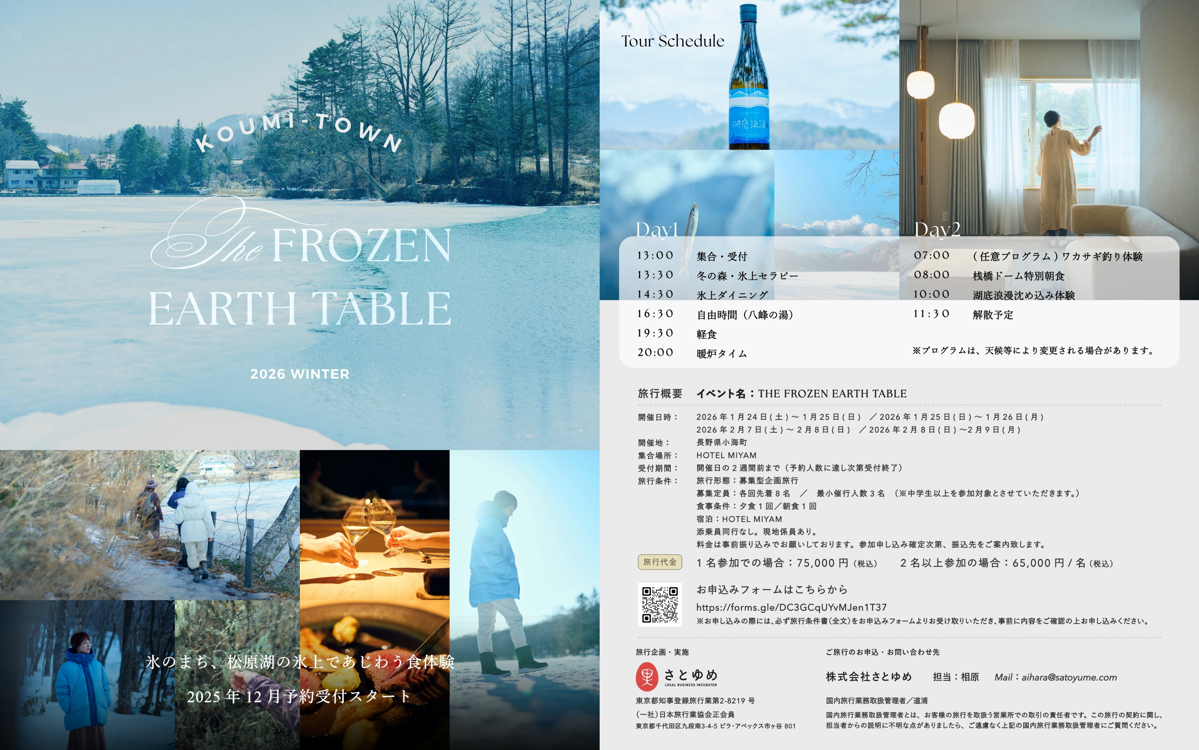 弊社は長野県小海町の冬の魅力観光推進事業の一環として、2026年冬に「The Frozen Earth Table」を開催します。本ツアーは、“凍てつく自然と共に食をあじわう” ことをテーマにした、冬の松原湖でしか実現できない氷上であじわう食体験ツアーです。