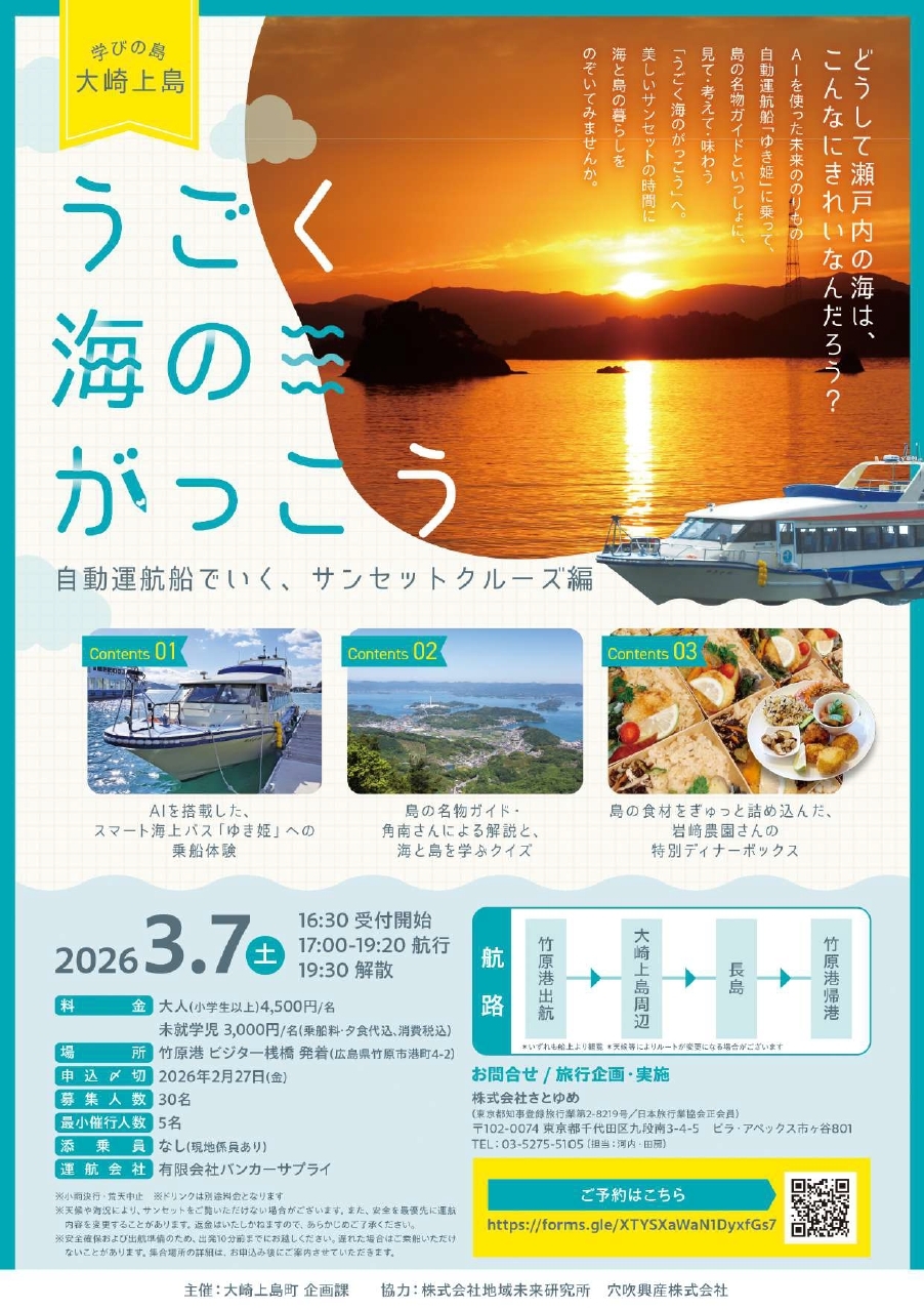 AIを使った未来ののりもの自動運航船「ゆき姫」に乗って、島の名物ガイドといっしょに、見て・考えて・味わう「うごく海のがっこう」へ。