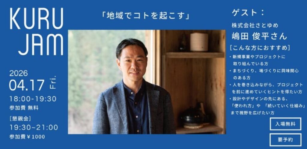 今回、ゲストとして弊社代表 嶋田が登壇し、「地域でコトを起こす」をテーマに、地域の内外の人を巻き込みながら構想だけで終わらせず“実際に動く事業“へと落とし込む地方創生について語ります。