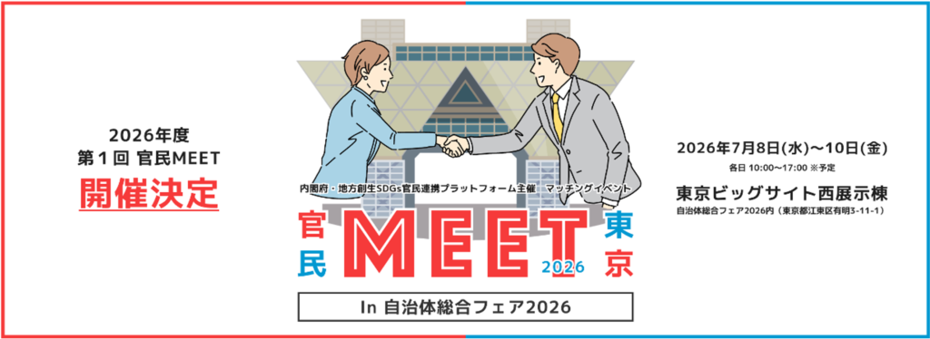 弊社と株式会社エイチ・アイ・エスが運営事務局を務める内閣府 地方創生SDGs官民連携プラットフォームは、2026年7月8日(水)〜10日(金)に東京ビッグサイトにて開催される「自治体総合フェア2026(第30回)」内にて、官民マッチングイベント「官民MEET東京」を開催します。